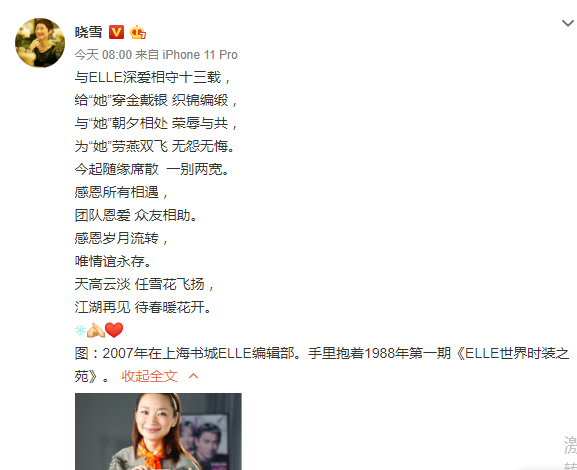 据oF时装商业评论报道,晓雪已于近日提出辞职,自2020年1月1日起将不再担任《LL世界时装之苑》编辑总监一职。该杂志专题总监薛剑(icolXu)在LL将晋升为编辑总监,时装总监诸葛苏佳LL晋升为编辑副总监。 晓雪本人今早发表微博确认此事。 据公开资料,晓雪真名为李辉,出生于1970年