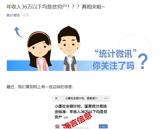 原标题:年收入36万以下是贫困户?统计局火速辟谣年内已2次回应收入相关问题 又人有造谣!近期,网上流传信息以“小康社会进入倒计时,国家统计局给出标准:年收入36万以下均是贫穷户”为题,称国家统计局提出了所谓富豪家庭、富裕家庭、中产家庭、小康家庭等的收入标准。 对此,12月11日,