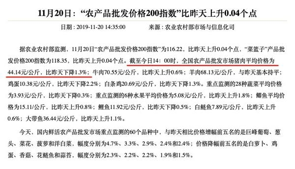 原标题:降降降降!降降降降!刚刚“二师兄”八连降 猪肉价格降降降降降降降降,八连降! 农业农村部今日最新发布的监测数据显示,截至11月20日14:00时,全国农产品批发市场猪肉平均价格为44.14元/公斤,比昨天下降1.3%。 根据监测,全国农产品批发市场猪肉均价已经连续八次出现下