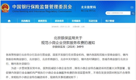 原标题:北京银监局也出手了!下文规范小微贷款收费此前两银行北京分行被国务院督查! “银行贷款,强售保险”让不少小微企业苦不堪言,如今这个现象正面临国务院、银保监会的重拳整治。 今天,北京银保监局正式印发《北京银保监局关于规范小微企业贷款服务收费的通知》(简称《通知》)。《通知》重申
