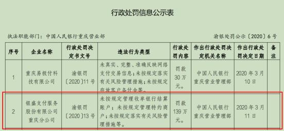 题:银盛支付违法违规遭开年第2罚一年内收央行6张罚单 3月17日,中国人民银行网站发布了人民银行重庆营业管理部行政处罚信息公示表(渝银处罚公示〔2020〕6号)。其中,处罚决定书(渝银罚〔2020〕13号)显示,银盛支付服务股份有限公司(简称“银盛支付”)重庆分公司存在以下违法行为:未按规定管理收单银行