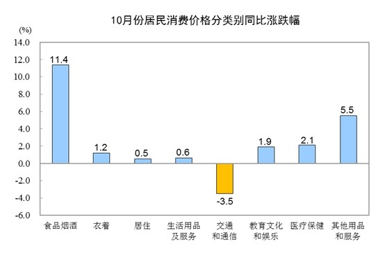 10月份,食品烟酒类价格同比上涨11.4%,影响CPI(居民消费价格指数)上涨约3.37个百分点。食品中,畜肉类价格上涨66.8%,影响CPI上涨约2.92个百分点,其中猪肉价格上涨101.3%,影响CPI上涨约2.43个百分点;禽肉类价格上涨17.3%,影响CPI上涨约0.21个百分点;鸡蛋价格上涨12.3%,影响CPI上涨约0.07个百分点;水产品价格上涨2.7%,影响CPI上涨约0.05个百分点;粮食价格上涨0.5%,影响CPI上涨约0.01个百分点;鲜菜价格下降10.2%,影响CPI下降约0.27个百分点;鲜果价格下降0.3%,影响CPI下降约0.01个百分点。