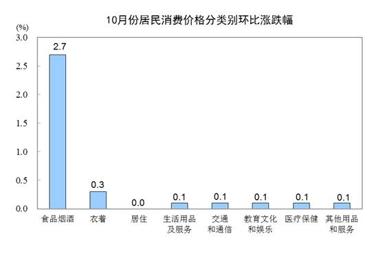10月份,全国居民消费价格环比上涨0.9%。其中,城市上涨0.8%,农村上涨1.2%;食品价格上涨3.6%,非食品价格上涨0.2%;消费品价格上涨1.4%,服务价格持平。