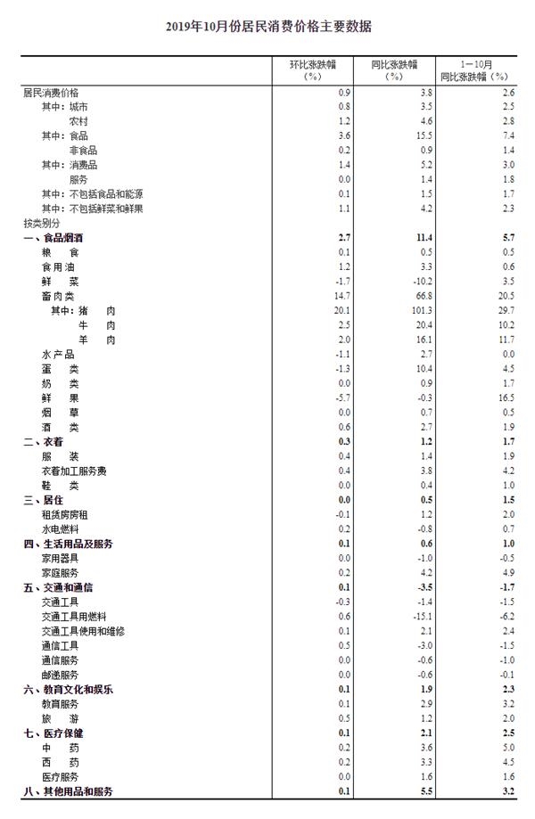 2019年10月份,全国居民消费价格同比上涨3.8%。其中,城市上涨3.5%,农村上涨4.6%;食品价格上涨15.5%,非食品价格上涨0.9%;消费品价格上涨5.2%,服务价格上涨1.4%。1--—10月平均,全国居民消费价格比去年同期上涨2.6%。