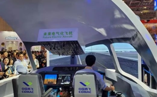 在中国馆主入口左侧,中国商飞的未来电气化飞机虚拟集成平台尤为引人注目。不仅在展示板上,C919、CR929、ARJ21等国产飞机共同演绎“阔步新时代、共襄蓝天梦”,现场还把C919的飞机头“搬”到了展馆,不少参观者在操作台上互动体验。