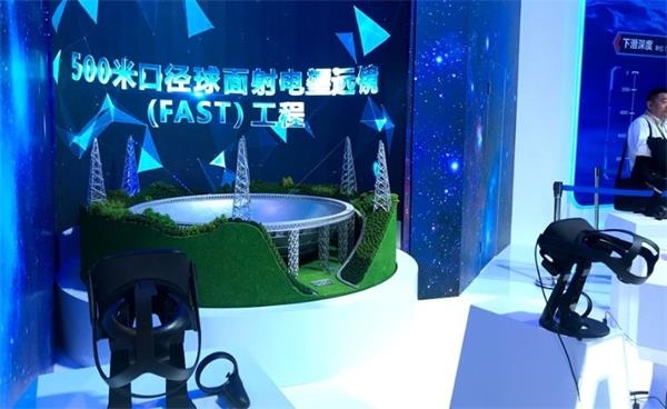 相隔不远的500米口径球面射电望远镜(简称FAST)展示同样精彩。FAST望远镜展示装置看上去小小的,一旦戴上了VR眼睛,或许你就能看见光年之外的脉冲星。