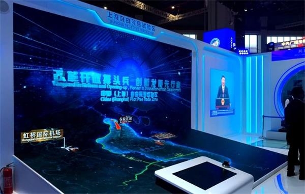 另一侧,巨大的“折叠”LED屏幕上展示了自贸试验区的重大意义,上面详细注明了“上海自贸试验区310多项制度创新成果在全国复制推广”成绩单。
