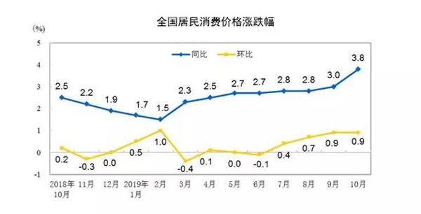 国家统计局9日发布数据,10月份,全国居民消费价格(CPI)同比上涨3.8%,涨幅比上月扩大0.8个百分点。