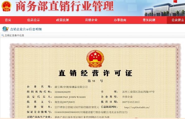 时间财经查阅商务部直销行业管理信息系统发现,康宝莱在2007年的3月获得直销牌照,获得批准的直销产品为1类16种,在册的直销培训员为149人,服务网点为611个。