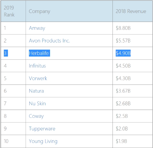 公开信息显示,康宝莱成立于1980年,总部在美国洛杉矶,2004年在纽约证券交易所上市。美国直销杂志《直销新闻》公布的2019年度DSN年度全球直销100强榜单显示,康宝莱以2018年年度营收49亿美元位于榜单第三名。