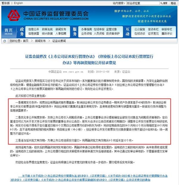2019年11月8日,证监会就修改《上市公司证券发行管理办法》《创业板上市公司证券发行管理暂行办法》等再融资规则公开征求意见,拟从精简发行条件、优化非公开发行制度安排、适当延长批文有效期和方便上市公司选择发行窗口等方面对再融资规则进行修订,这使得沉寂已久的定增市场又开始受到市场关注。