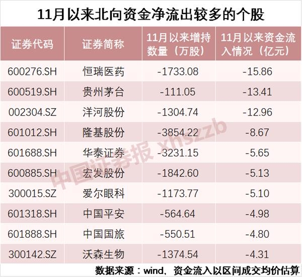 凯丰投资则指出,临近年底,北向资金也有落袋为安的趋势。从上周情况看,大基建、金融等估值偏低品种受到北向资金热捧,叠加市场低迷所致的破净股数量上升,上周北上资金大幅增持了宝钢股份、建设银行、中国银行等破净股。上周除了大幅减持贵州茅台外,对于年内涨幅巨大的恒瑞医药、招商银行、中国国旅等也大幅减持。