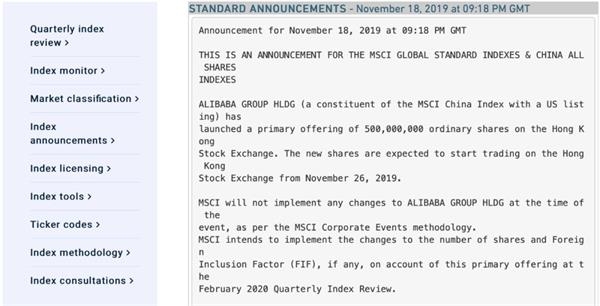 19日消息,MSCI发布公告称,MSCI中国指数成分股、MSCI新兴市场成分股阿里巴巴5亿新股11月26日开始在香港上市交易时,公司暂不就其股份数量变化作任何调整。MSCI计划在明年2月进行指数季度审核时,对阿里巴巴股票数量及其与香港上市相关的自由流通调整因子作出调整。
