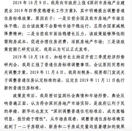 对于调整普通住房标准,《报告》指出:“2019年10月9日,深圳市住房和建设局向市政府上报《深圳市房地产业建筑业2019 年四季度稳增长工作方案》,其中明确提出调整普通住房标准政策。原因在于:一是目前全国及深圳市房地产市场总体平稳,出台该政策不会影响市场平稳运行,且符合国家减税降费精神;二是当前面临稳增长压力,该政策能够降低刚需购房成本,促进合理住房消费,活跃房地产市场;三是该政策前期已研究议定,深圳市住房和建设局认为可以正式发布。”该政策已于11月11日发布并实施。