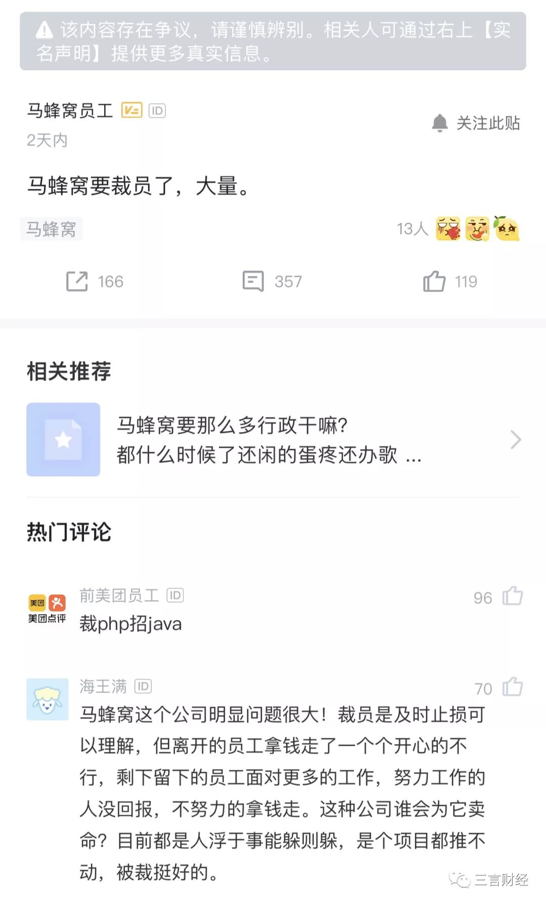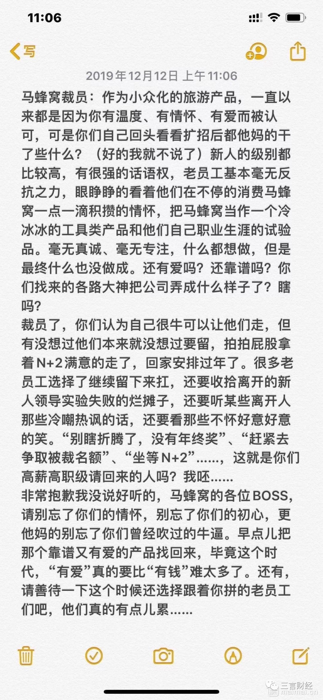 三言财经12月12日消息,近日,有多名网友在脉脉上爆料称马蜂窝即将裁员,其中不乏认证的马蜂窝员工爆料。