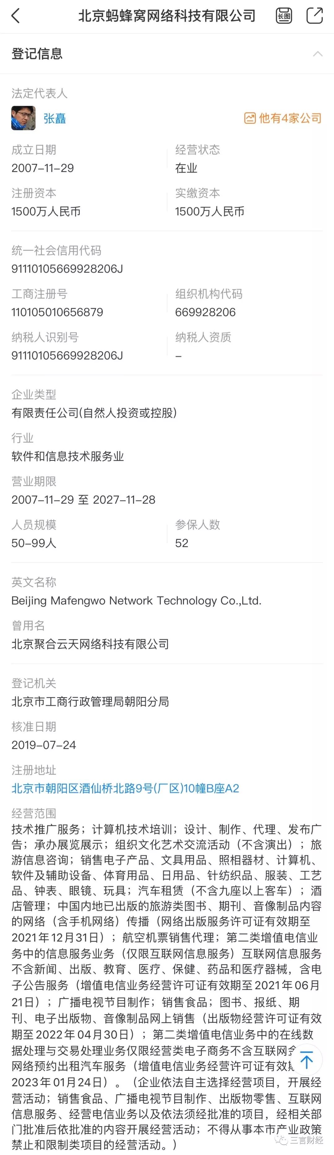 天眼查数据显示,马蜂窝的运营主体北京蚂蜂窝网络科技有限公司成立于2007年11月,注册资本为1500万人民币,法定代表人为公司技术副总裁张矗,经营范围包括技术推广服务;计算机技术培训;设计、制作、代理、发布广告;承办展览展示;组织文化艺术交流活动(不含演出);旅游信息咨询等。
