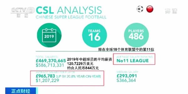 报告显示,2019年中超球员的平均薪资为120.7229万美元,约合人民币844万元。排在全球18个体育联盟中的第11位,在足球联赛中仅次于欧洲五大联赛。