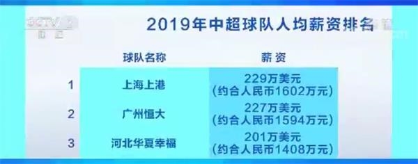 2019年,中超人均年薪最高的球队为上海上港229万美元,约合人民币1602万元。广州恒大与河北华夏幸福分别以227万美元和201万美元位列第二、三位,约合人民币1594万元与1408万元。