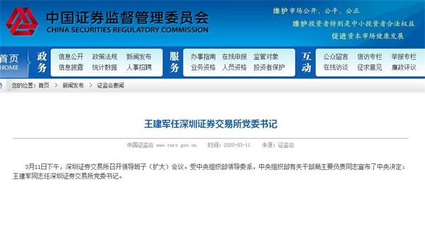 3月11日,证监会、深交所官网显示,中央决定,王建军任深交所党委书记。