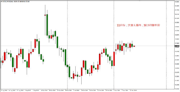 11月份已经过去了一半,原油价格基本处在震荡区间之内,上限58美元/桶,下限56美元/桶,区间较窄,不建议短线参与。美伊矛盾尚未出现新动向,市场对原油关注度较低。