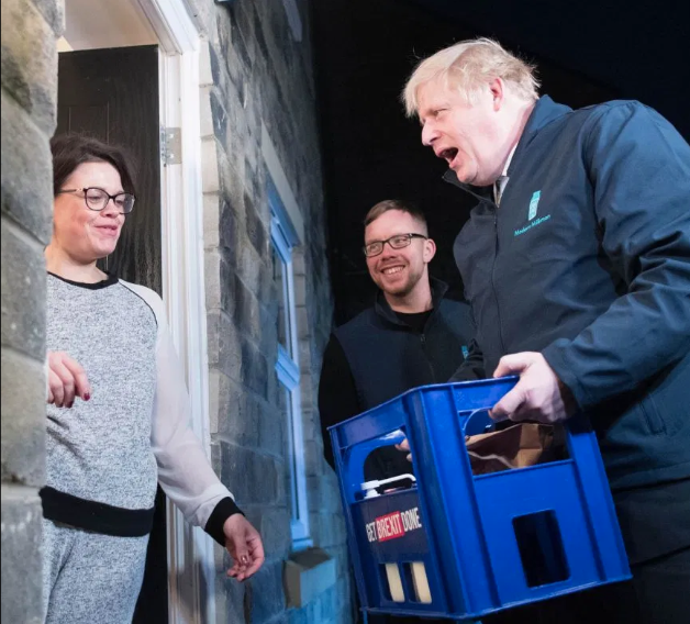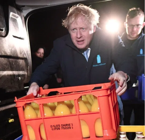 为拉选票拼了!英国首相约翰逊当起搬运工 给选民上门送牛奶