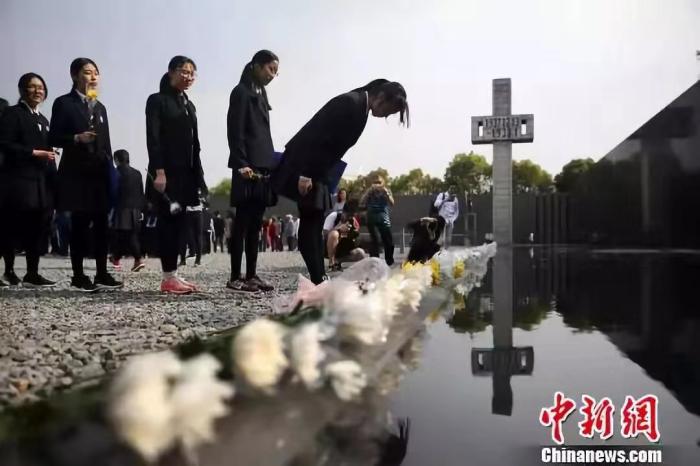 中学生向南京大屠杀遇难同胞纪念碑鞠躬。