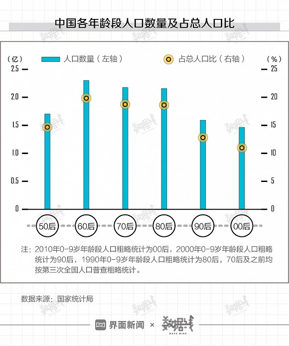 90后有多金贵?从数量上看,相对于前几代人,90后人口数量下滑明显。根据第六次全国人口普查,2010年时0-9岁人口的数量仅为1.59亿,占当时总人口比12.81%。而根据前几次人口调查数据,60后、70后、80后人口数量约为2.30亿、2.17亿和2.16亿,均占当时总人口比的18%以上。