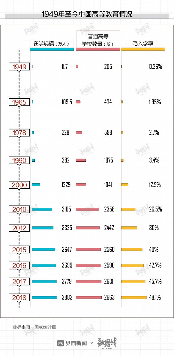 从高等教育情况来看,2018年中国高等教育毛入学率为48.1%。这一数字在90后刚出生时候,仅为3.4%。
