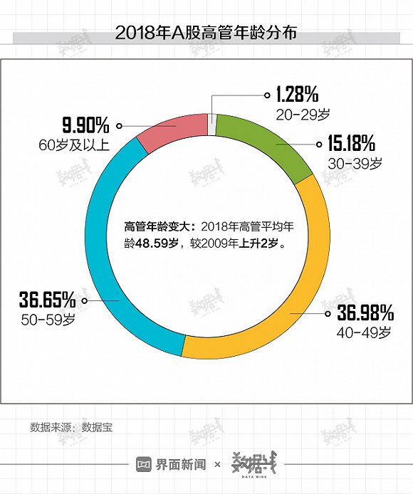 而靠自身的努力当上公司高管,也变得越来越困难。数据宝数据显示,2018年A股高管平均年龄为48.59岁,较2019年上升2岁。2018年,A股高管中20-29岁的年轻人占比仅为1.28%。