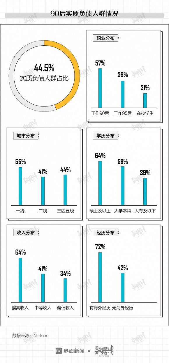 Nielsen数据显示,90后债务收入比为41.75%。除了房贷、车贷,互联网分期消费贷款、信用卡和互联网小额借贷成了90后债务的三座大山。