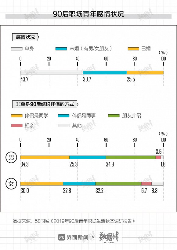 《2019年90后青年职场生活状态调研报告》数据显示,在职场上奋斗的90后里面,43.7%仍保持单身。而那些“撒狗粮”的90后,大多是同学、同事关系,或是通过朋友介绍认识,其中只有不到10%的90后是靠相亲走到一起。