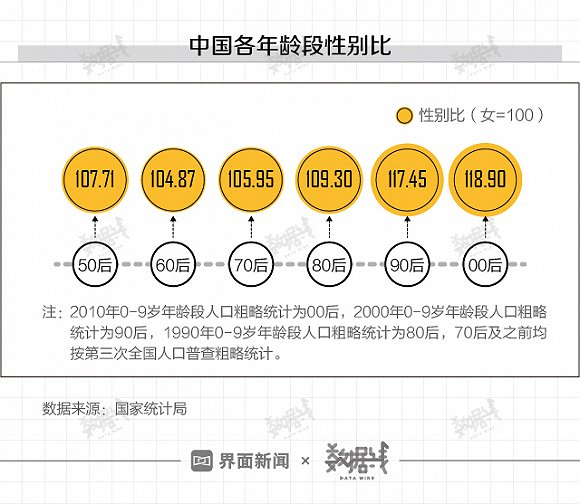 国家统计局数据显示,从50后到80后,中国男女性别比一直保持在110以下(也就是110个男性比100个女性)。而轮到90后时,性别比陡升至117.45。