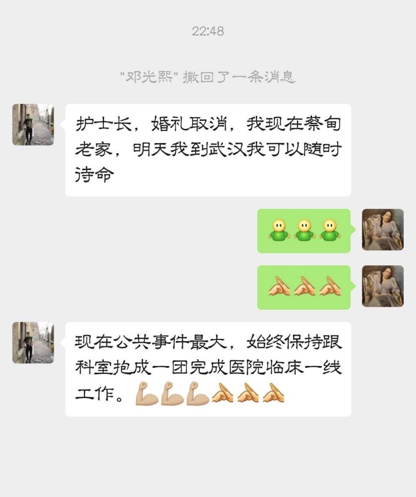 1月23日晚,下班后的邓光西匆匆赶回新城区乡下的父母家,与父母商谈此事,正在当班的妻子小朱也通过电话与自己的父母取得了沟通。“看了最近的新闻,父母们说再大的事也抵不过公众的健康和安全,我们身为医务人员,这是我们该有的责任和担当,其他的事情由他们来处理,让我们安心上前线。”邓光西说,他们很感谢长辈的理解和支持。当晚,小邓就给护士长李静发了消息请命:“护士长,婚礼取消,随时待命。”