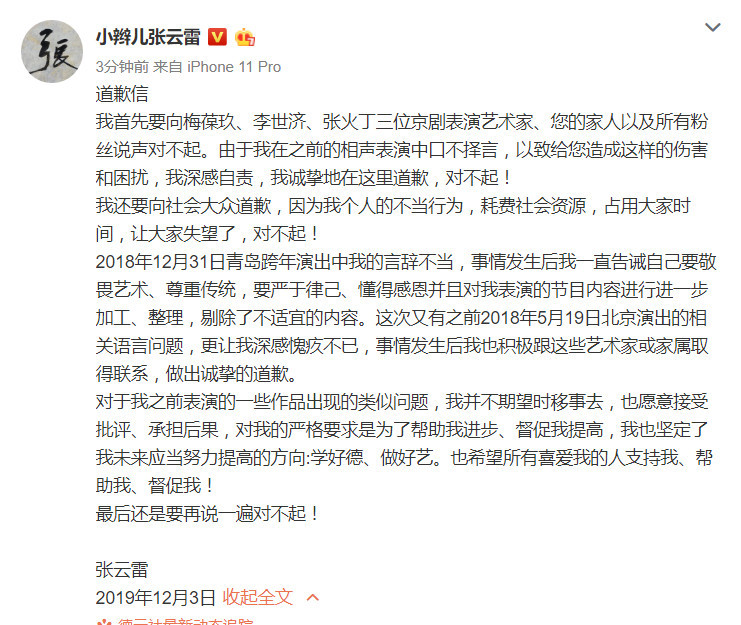 12月3日,张云雷发文就在相声中调侃京剧艺术家一事道歉,对于之前表演的一些作品出现类似问题,愿意接受批评承担后果。