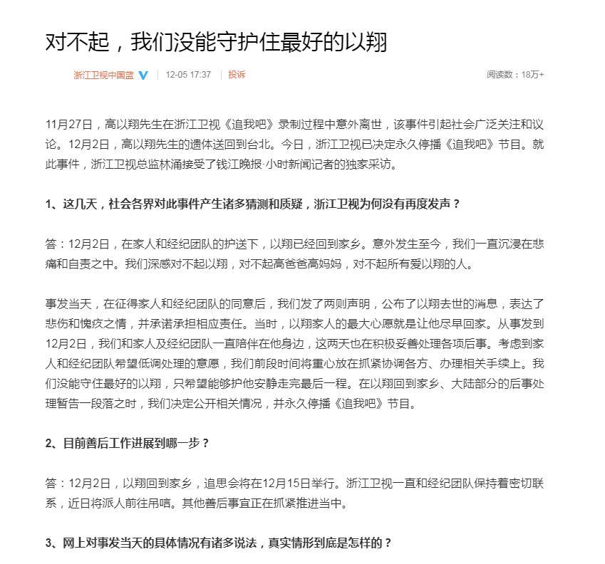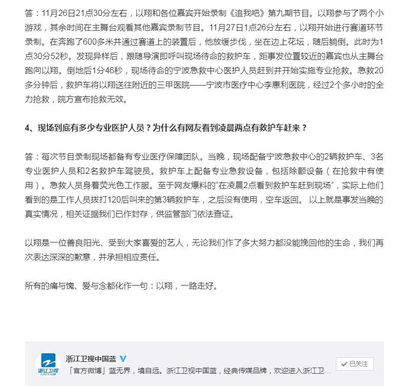 而在浙江卫视此次公开发声之前,高以翔吧官微于12月3日提出20条问题,指责浙江卫视和《追我吧》节目安全意识薄弱、淡漠生命,对资本的极端逐利,以及对于广大群众要求的充耳不闻。从浙江卫视今日接受采访的内容来看,部分回应可以回答“20问”中的质疑,但也有部分问题尚未触及,《一线》将一问一答进行了整理。其中,有11问可以在浙江卫视的此次发声中找到答案。
