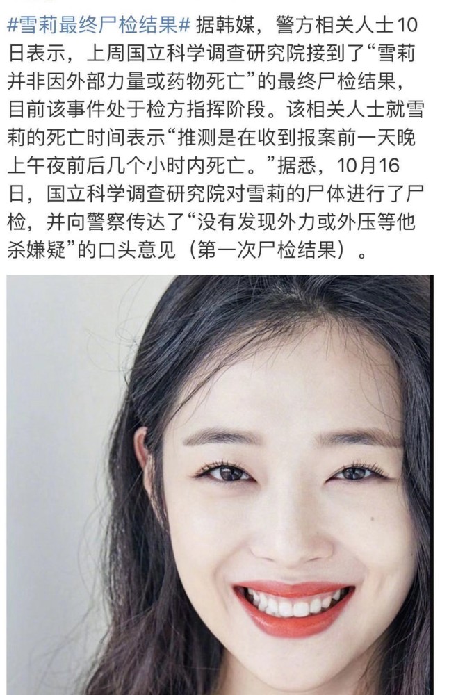 韩国媒体报道,雪莉的死亡时间,根据推测是在报案前一天(10月13日)晚上午夜前后几个小时内。