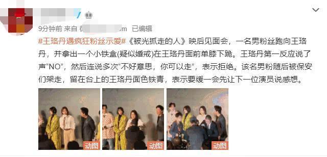 12月9日,王珞丹在《被光抓走的人》映后见面会上,再次遇到男粉丝疯狂示爱跪地求婚,王珞丹严词拒绝:“不好意思,你可以走!”随后几名保安赶紧跑上台架走了该男粉丝。