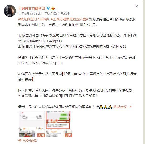 我们通过在王珞丹官方粉丝团微博上面了解到这个貌似是一个人。并且发布针对某男性在首映礼以及长期以来的骚扰行为做出公告。