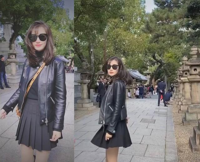 身穿黑衣黑裙子以及黑色长袜,偏见散发整个人就是日系风装扮。一双大长腿穿上黑色长筒袜,与白皙皮肤形成鲜明对比,更加衬托出皮肤的白嫩。内搭是高领针织和百褶裙,感觉有一种校园少女的青春可爱。这样的短裙特别的显腿长,这种打扮应该是马蓉游玩的标准装扮,之前她前往日本也是类似的装饰。