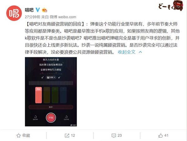 唱吧此前在官方微博发布声明回应称,“抄袭一说纯属碰瓷营销。是否抄袭完全可以通过法律手段解决,没必要浪费公共资源做碰瓷营销。”