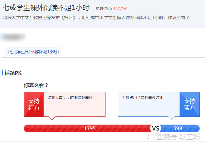 一时间,“七成中小学生课外阅读不足1小时”成为热门话题,在某平台发布的与此有关的话题中,实时讨论数量超过100万以上,有约2400人参与投票,其中认为“课业太重,没时间课外阅读”的有1795票,认为“手机占用了课外阅读时间”的有598票。